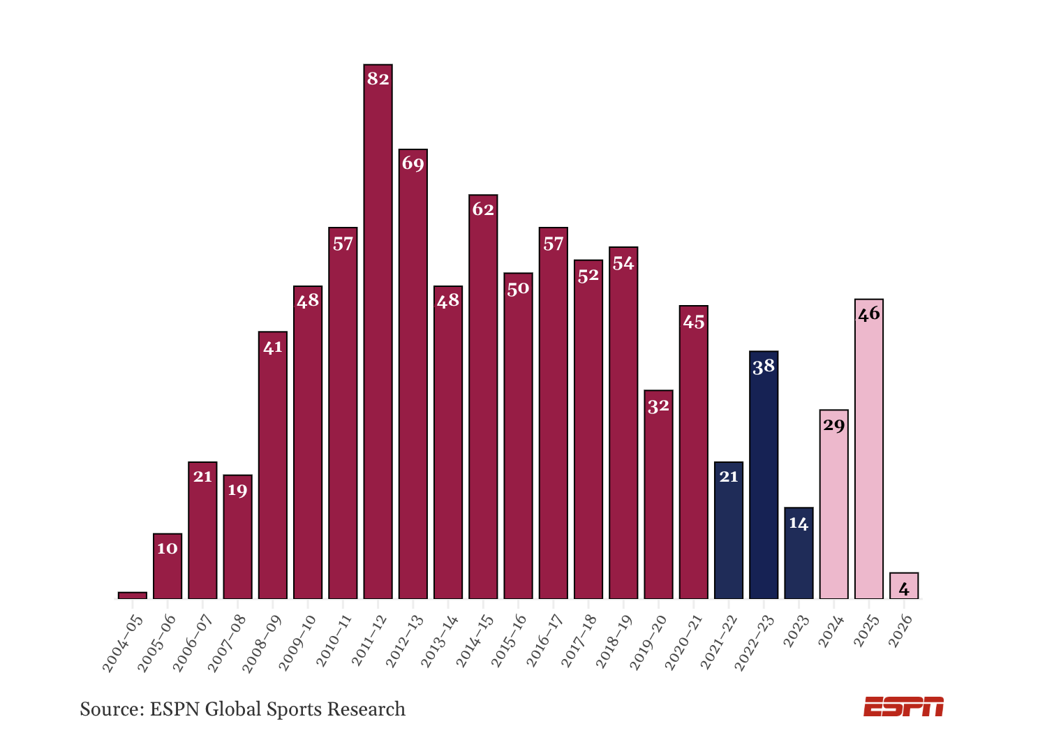 Messi has averaged around 36 goals a season for club and country since moving to MLS in July 2023 (81 for Miami, 12 for Argentina). However, with uncertainty over how much longer he will continue to play for Argentina -- speaking to ESPN in December, he would not confirm that he will play at the 2026 World Cup -- that rate would likely drop if he is no longer playing international games.