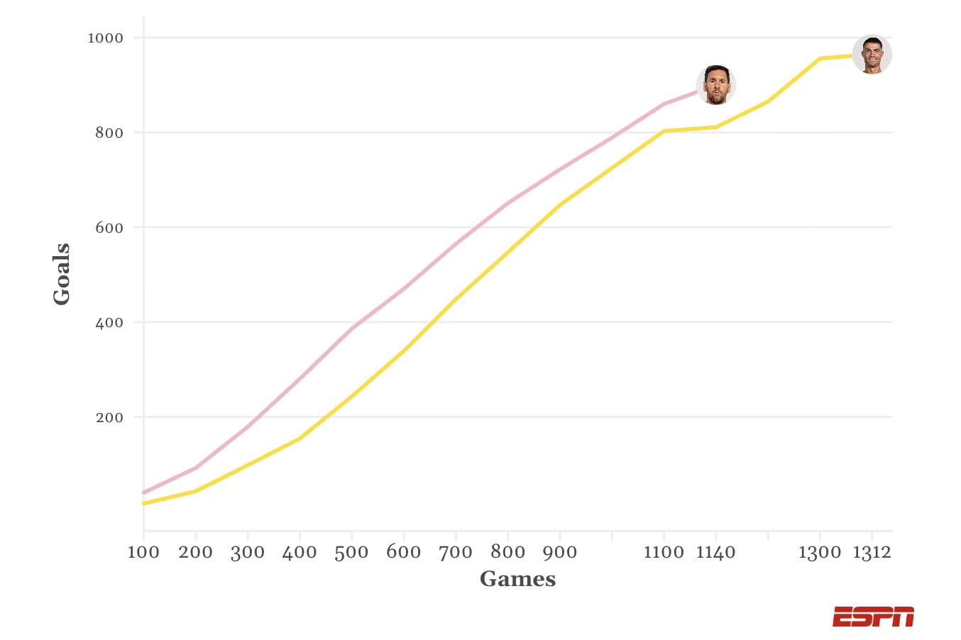 In that scenario, Messi could end his career with a total of 968. Again, that's a ballpark calculation, but it gives an indication of how time is very much on Messi's side as the younger man of the two rivals.