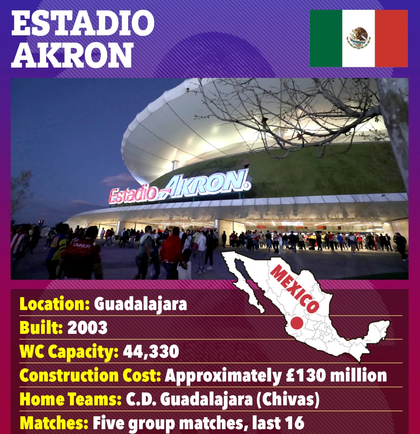 The Estadio Akron in Guadalajara is dubbed the ‘football volcano’ because it has been built into a man-made hill – and its sides are covered by natural grass.